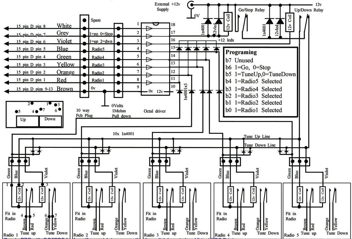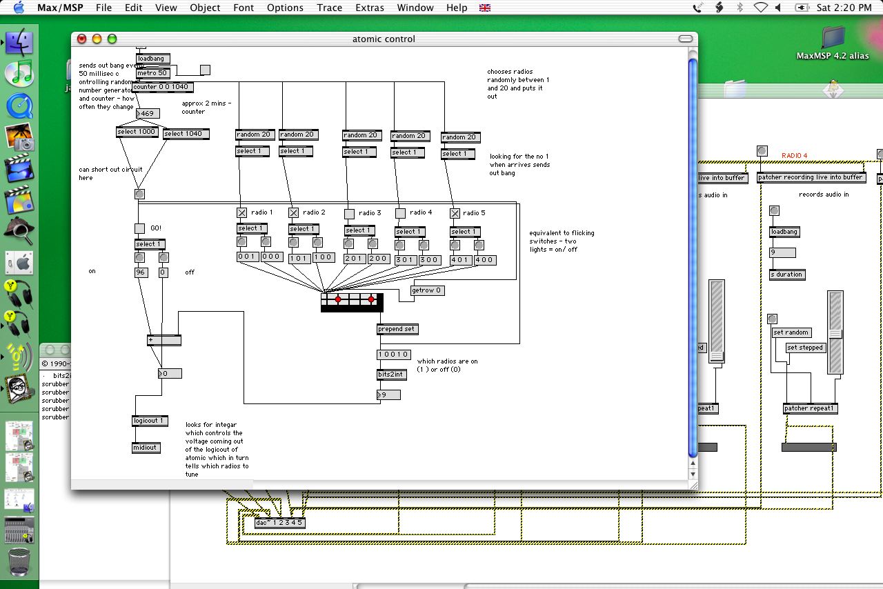The radio speaker in each radio is disconnected and the five independent signals are fed live into the computer. The data is read and tuned to a score composed in Max MSP. This concentrates on repeating and granulating the information. The audio data is then fed back out of the computer into the radio and reconnected to the radio speaker as if unaltered.